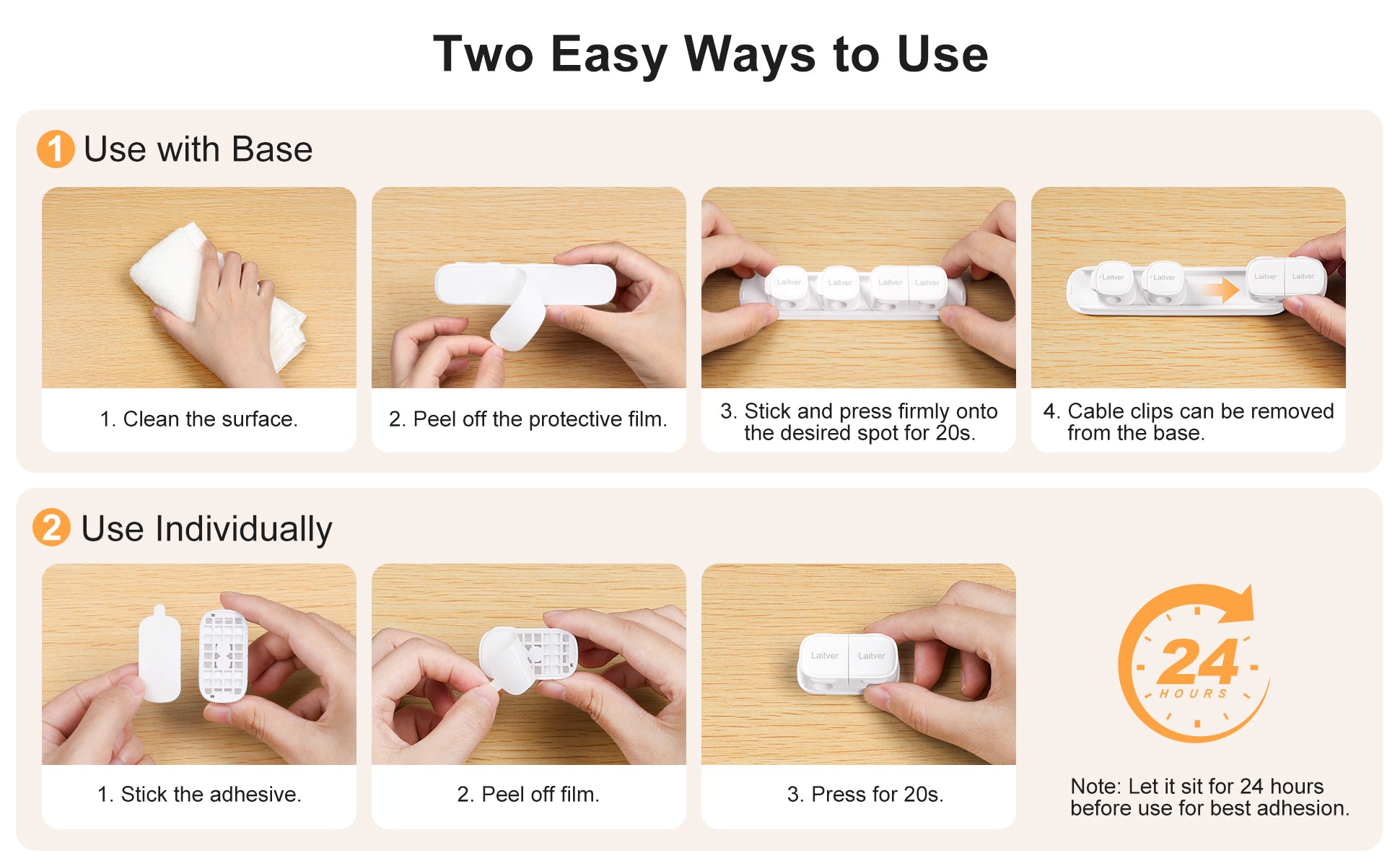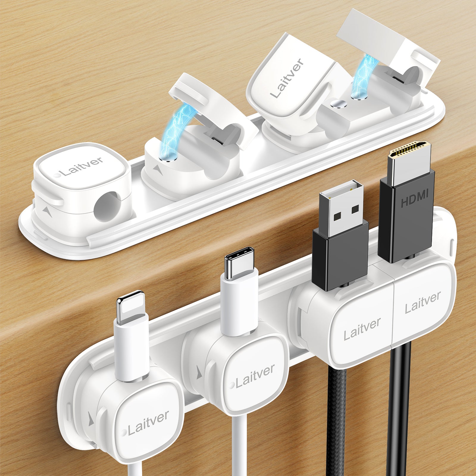 Versatile & Flexible Combination: Laitver magnetic cable clips include 4 single cable clips + 2 double cable clips + 2 plastic bases, which can easily meet the needs of organizing 8 cables. The dual cable clip can separate two cables to prevent entanglement; the single cable clip can fix one cable in place, which is ideal for thin cables. The two cable clips can be moved freely on the plastic card base. Whether used alone or in combination, they can meet your various usage scenarios.